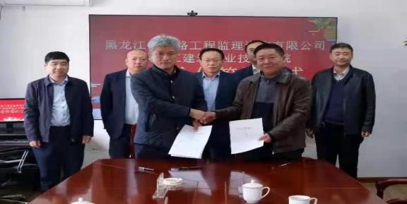 市政工程技术专业群为落实职教20条中“推动校企全面加强深度合作”“打造一批高水平实训基地”“多措并举打造‘双师型’教师队伍”“开展高质量职业培训”等基本任务。2021年4月13日,市政与环境工程系主任边喜龙、副主任吕君、于景洋一行三人到黑龙江省交投集团黑龙江省公路工程监理咨询有限公司,与企业签订产教合作协议,黑龙江省交投集团黑龙江省监理咨询有限公司董事长王彪、总经理李强、纪检书记才木、副总经理何晓东、办公室副主任田春雷参加签约协议。