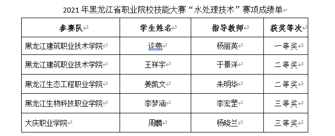 本次大赛主办是单位黑龙江省教育厅,承办单位是黑龙江建筑职业技术学院市政与环境工程系,共4个学校8支队伍参加比赛,参加比赛的学校有黑龙江建筑职业技术学院、黑龙江生态工程职业学院、黑龙江生物科技职业学院、大庆职业学院。本次比赛分为上午场和下午场,每场4名选手。