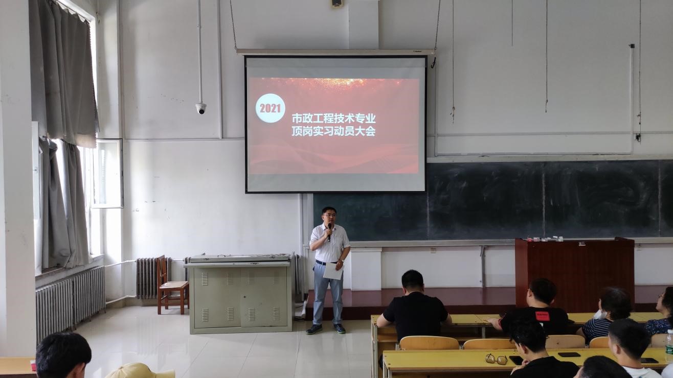 为了全面安排部署2019级学生顶岗实习工作,让学生了解实习期间安全、管理等方面内容,顺利完成顶岗实习,市政工程技术专业于2021年5月21日,召开2019级学生顶岗实习动员大会。市政工程技术教研室全体教师及2019级学生参加了会议。会议由市政工程技术教研室副主任郭启臣老师主持。